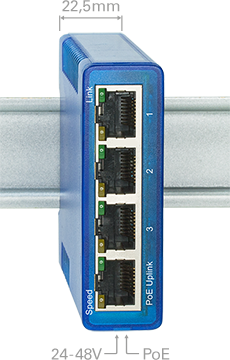 Der kompakte Industrie-Switch verbindet im Schaltschrank bis zu vier Netzwerkkomponenten mit bis zu einem Gigabit Datenrate. Der Switch wird über eine steckbare Schraubklemme mit 12-48V versorgt. Ein Port kann als Monitorport konfiguriert werden.